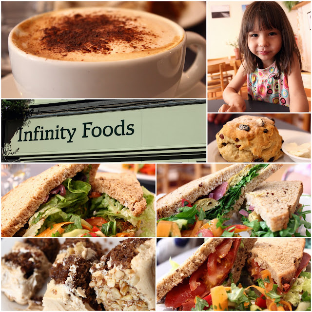 We spent a while feeling the water (it was cold), making castles, looking for shells and just enjoying the view. The fog started to go away and we started to get hungry. We went to Infinity Foods, they were out of most of their hot meals, but they still had some great sandwiches for us to try. We had the veggie sausage sandwich, a veggie BLT, and a falafel hummus sandwich. They were all excellent. Sophie then insisted on a cake and Chuy for some odd reason picked a coffee cake...to give to a 4 year old... It was good though, really good. And then Chuy craved a cappuccino, so he got that and sneaked in a scone.